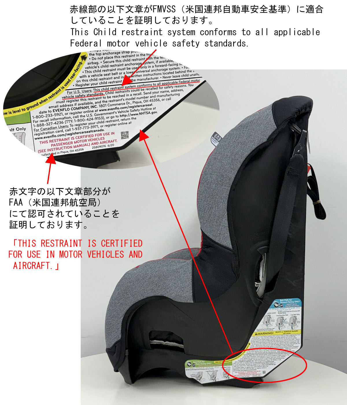 | 安全基準 | FMVSS(米国連邦自動車安全基準合格品) FAA(米国連邦航空局)認可 ※飛行機での使用もできます。 但し、実際の使用に関しては、ご利用の各航空会社へお問合せください。 サイドインパクトテスト合格品 米国基準ISOFIX対応 |