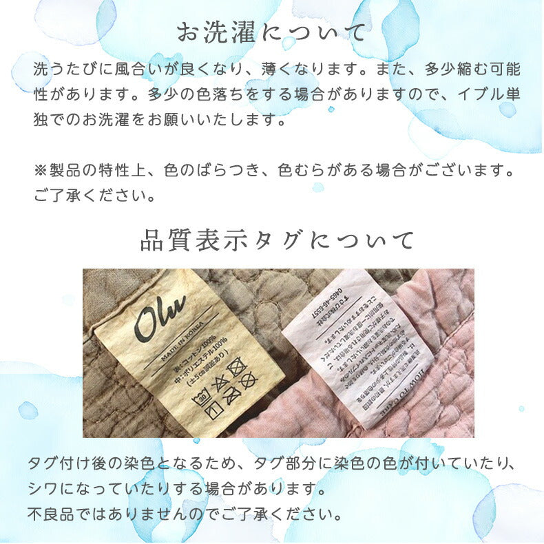 | お手入れ方法 | 洗濯機で丸洗いできますが、多少の色落ちをする場合がございます。 必ず他の衣類と分け、イブル単体で洗濯ネットに入れてお洗濯をお願いいたします。 蛍光増白剤無配合の中性洗剤をご使用ください。漂白剤は使用しないでください。 生地の傷みや縮み、縫い目のほつれが発生する恐れがあるため、乾燥機のご使用はお控えください。 |