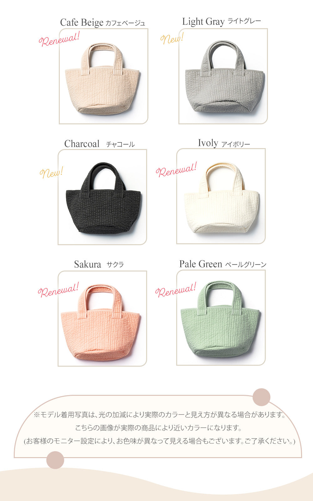 ヌビバッグは凹凸のあるキルティング素材なので、しわになりにくく、ミニトートをたたんで旅行などの小さめサブバッグとしてもお使いいただけます。