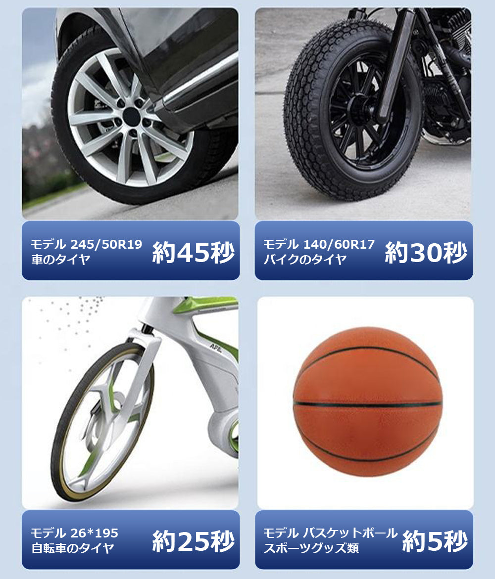 フルバッテリー稼働時間 | フル充電すると約20分で2本のタイヤを膨らませることができます |