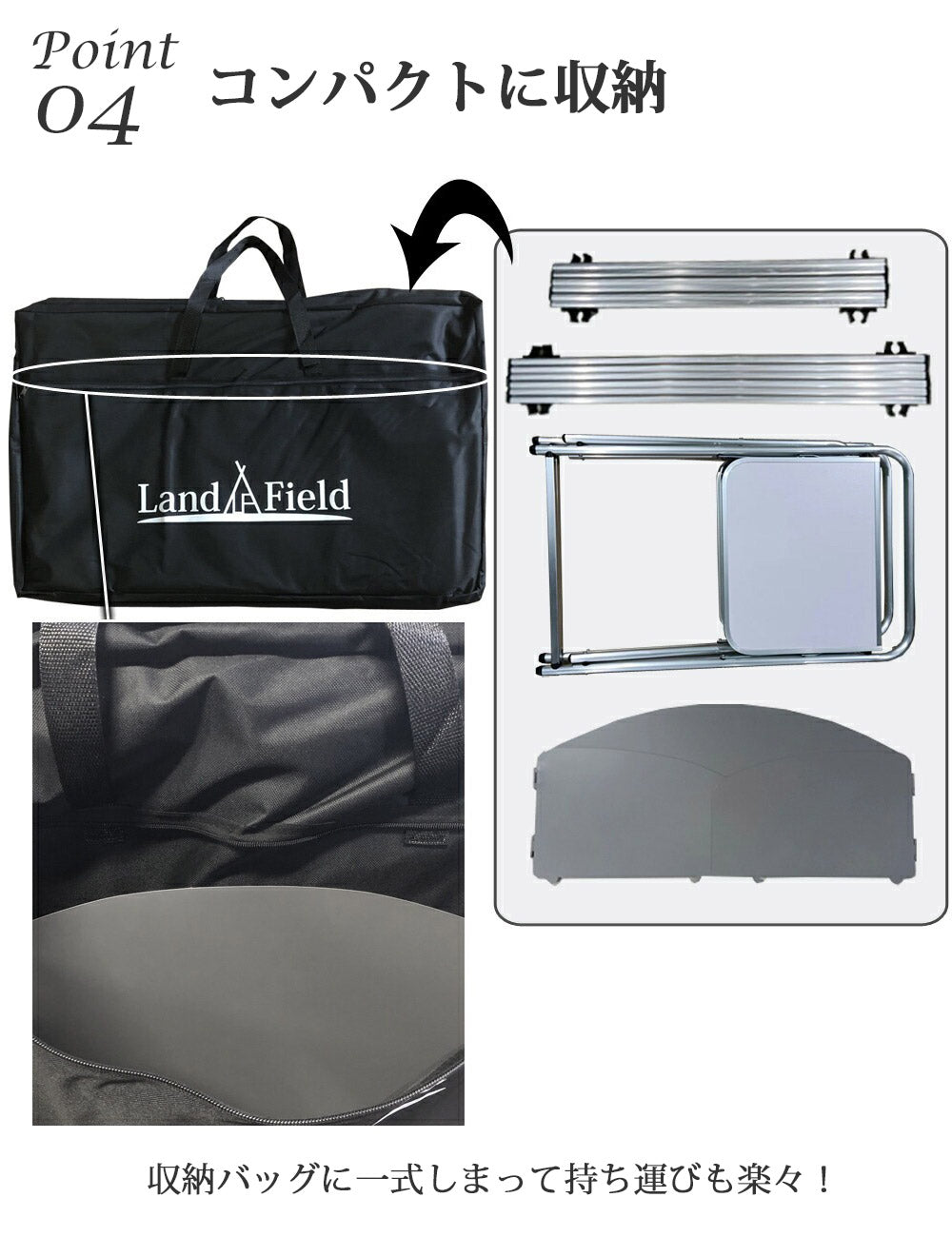 メイン天板やラック天板は取り付け・取り外すタイプですが、収納バッグに入れておけば、まとめられてかさばらずに収納・運搬が可能です。