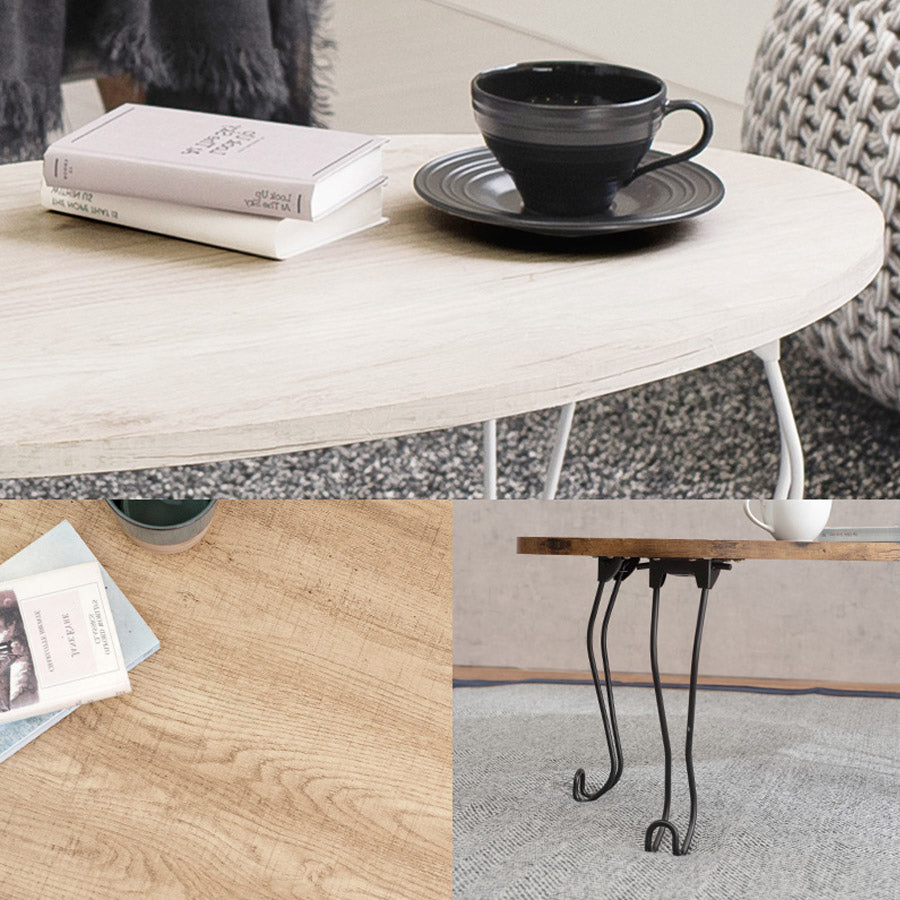 | 古木風の木目を再現した天板にアイアンの猫脚を合わせた、シックな可愛さのあるデザイン。折りたたみ式なのでコンパクトに収納可能 ■折りたたみ式 |