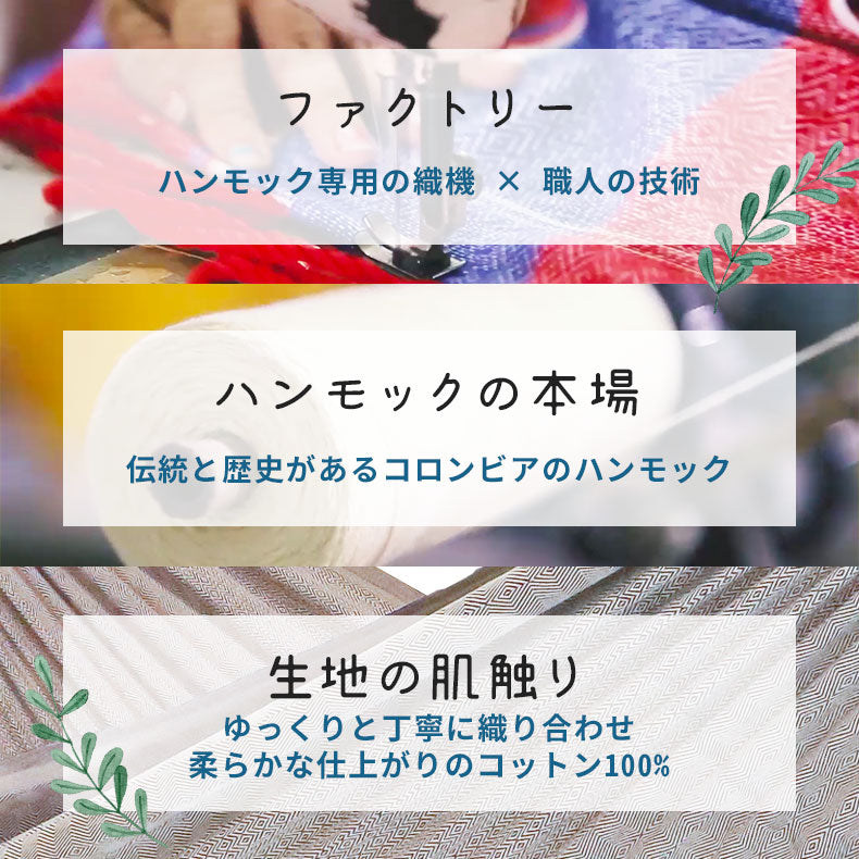 日本の裏側にあるハンモックの本場、南米コロンビア。インディヘナ(先住民)の人々により作られたハンモックの伝統が今も息づき、人々に根付いています。
