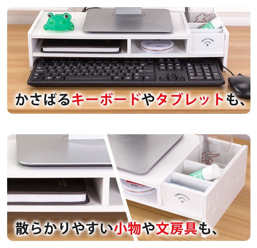しまいやすく、取り出しやすい。収納力抜群のモニターラックで、デスクまわりスッキリ!豊富な収納スペースで散らかりがちな小物をまとめて収納できます。かさばるキーボードやタブレットはモニター下に収納できるため、狭いデスクでも広々とした作業スペースを確保できます。