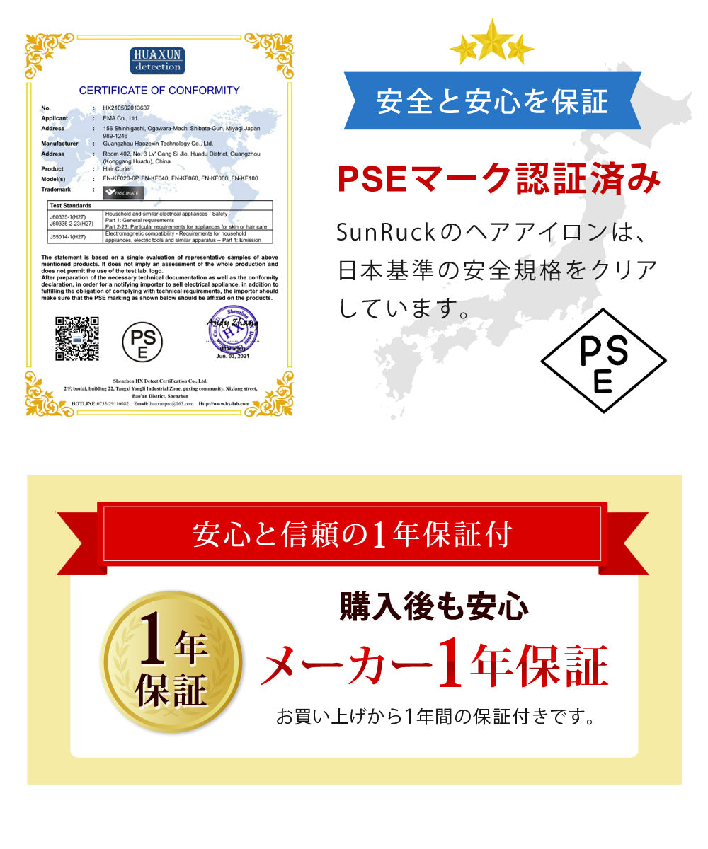 SunRuckのヘアアイロンは、日本基準の安全規格をクリアしています。