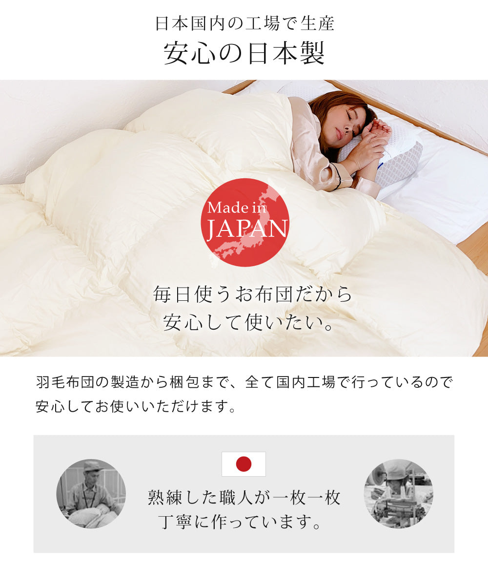 羽毛布団の製造から梱包まで、全て国内工場で行っているので安心してお使いいただけます。
