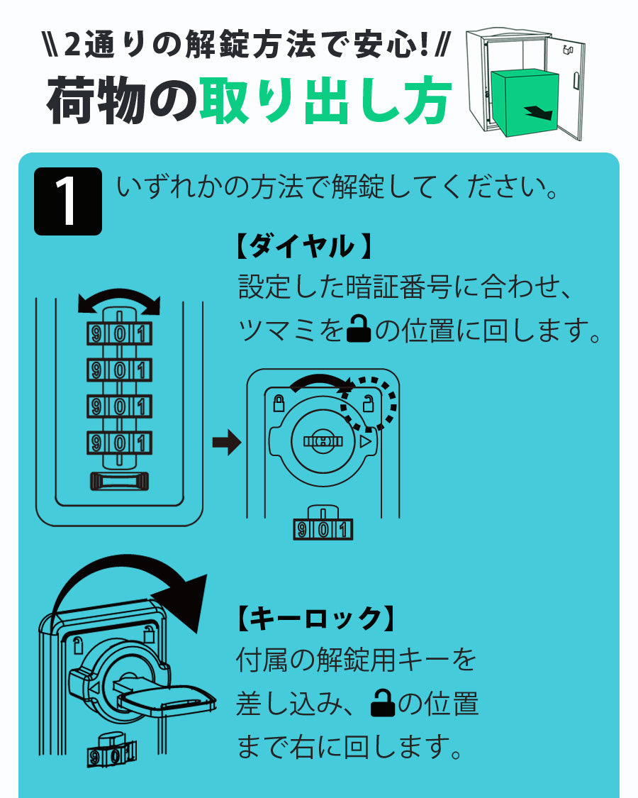 付属品 | ダイヤル南京錠×1、解錠用キー×2、ワイヤー×1、固定用アンカー×4、配達員説明用マグネットシート×1、取扱説明書×1 |