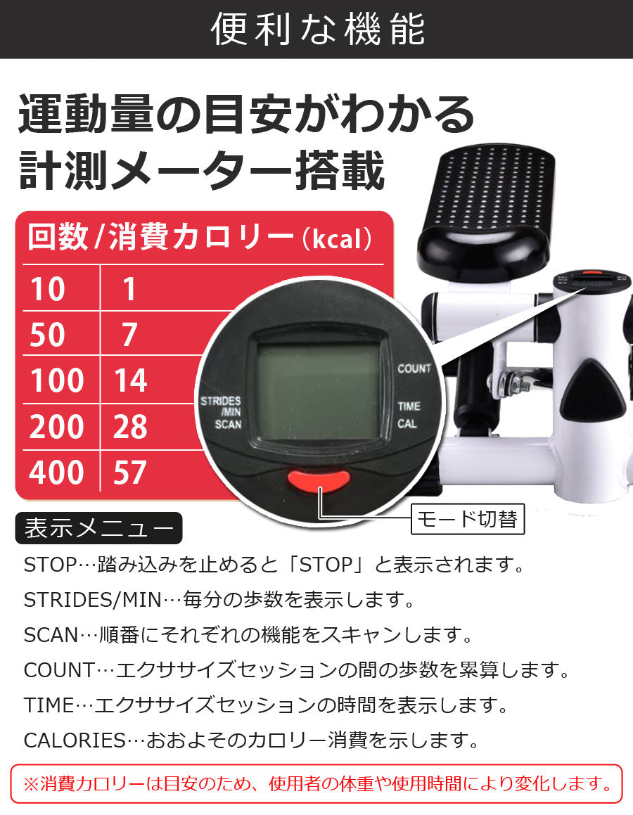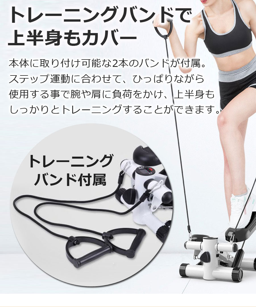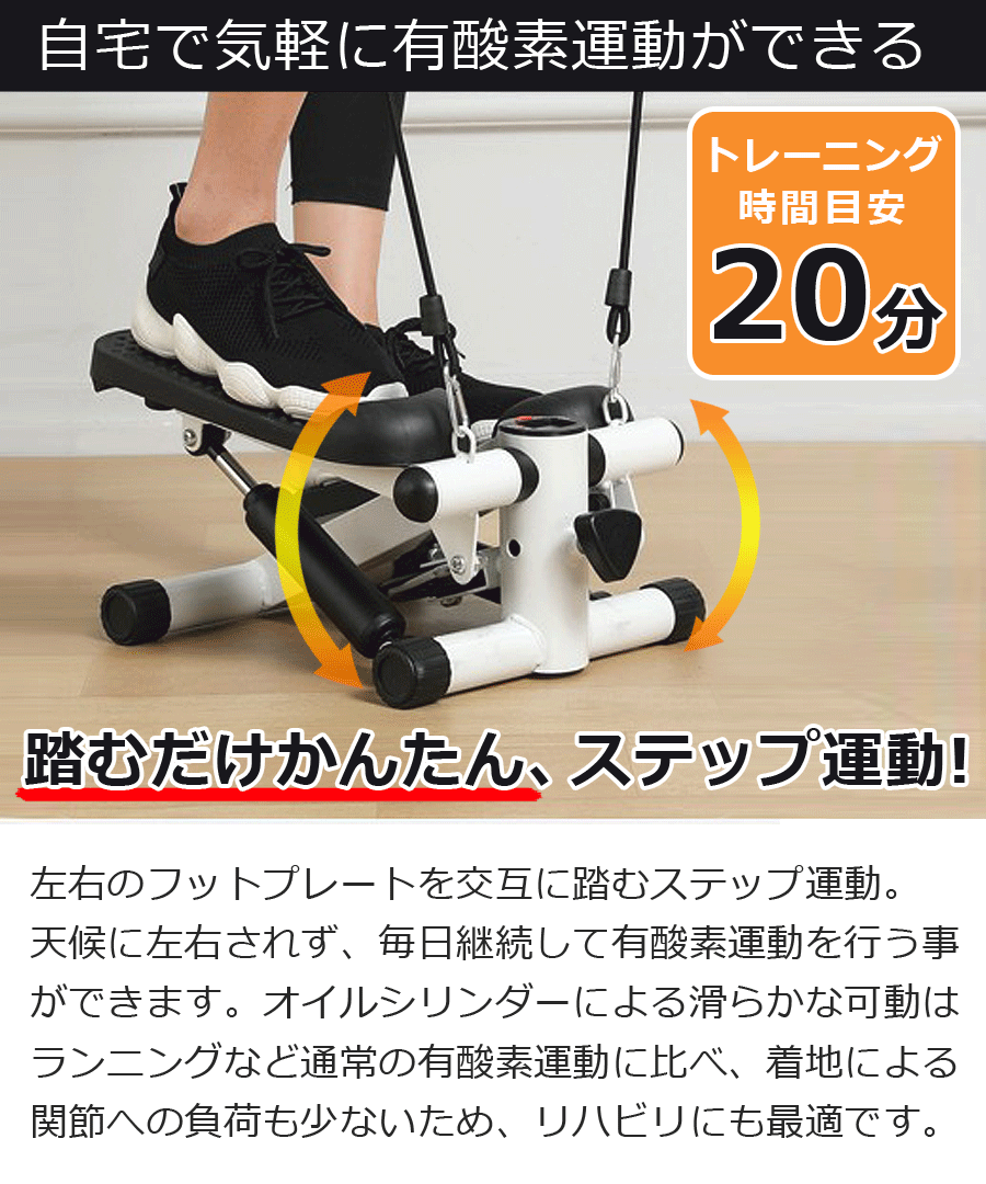 外に出なくても、自宅でくつろぎながら、すき間時間の有効活用にも 室内で気軽に有酸素運動ができるフィットネスステッパー 自宅で気軽に有酸素運動ができる ■踏むだけかんたん、ステップ運動! 左右のフットプレートを交互に踏むステップ運動。 天候に左右されず、毎日継続して有酸素運動を行う事ができます。オイルシリンダーによる滑らかな可動はランニングなど通常の有酸素運動に比べ、着地による関節への負荷も少ないため、リハビリにも最適です。 ■ジョギング感覚で 全身トレーニング 通常のステップ運動に慣れたら、 ジョギング感覚でのトレーニングが おすすめ。腕を振ることで上半身も 同時に鍛える事ができます。 ■すき間時間の有効活用にも! 簡単運動だから勉強や家事の合間、休憩中など毎日のすき間時間を使って、手軽に効果的な トレーニングを行うことができます。 便利な機能 ■運動量の目安がわかる 計測メーター搭載 ※消費カロリーは目安のため、使用者の体重や使用時間により変化します。 ■シリンダー内蔵、なめらかな可動 油圧式シリンダーの可動によりスムーズで滑らかなステップ運動が可能。着地時の負荷が少ないため、通常の有酸素運動よりも関節を傷めずに少ない負荷でトレーニングを行う事ができます。 ■トレーニングバンドで 上半身もカバー 本体に取り付け可能な2本のバンドが付属。ステップ運動に合わせて、ひっぱりながら使用する事で腕や肩に負荷をかけ、上半身も しっかりとトレーニングすることができます。 |