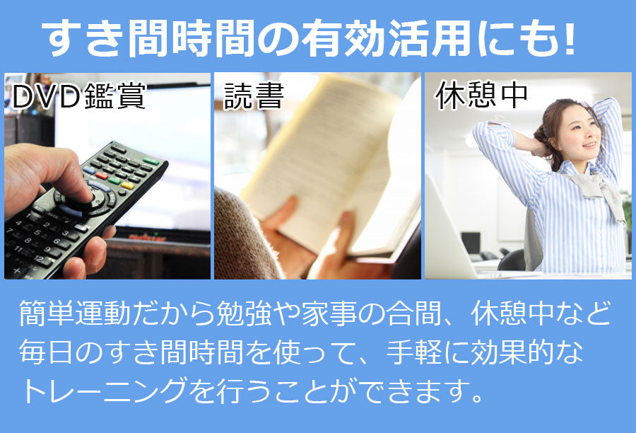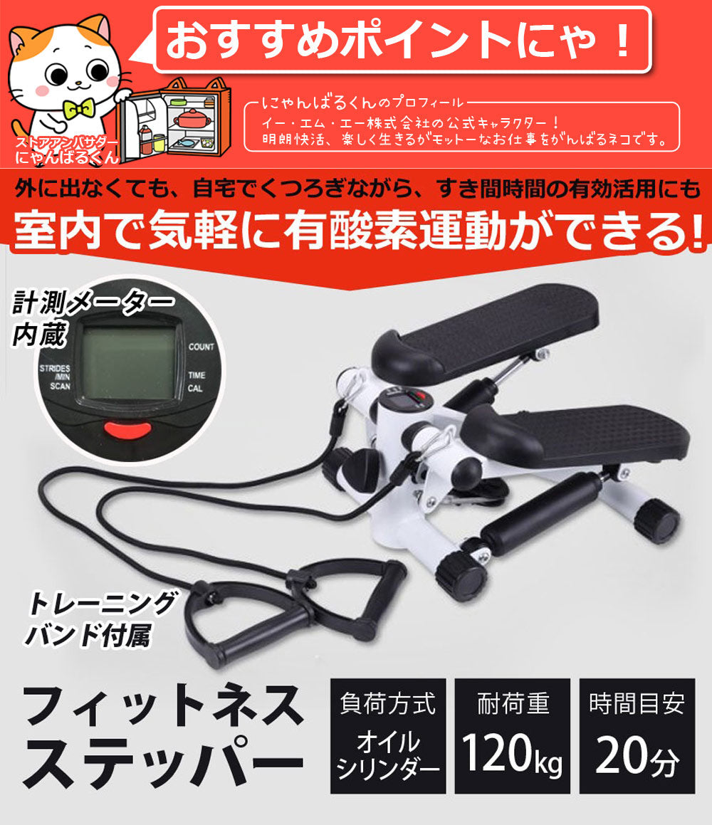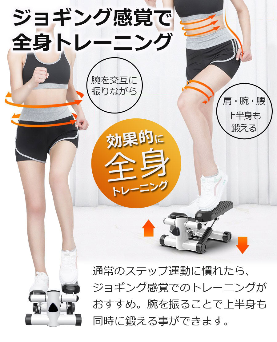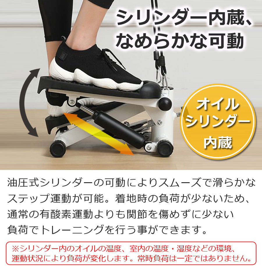 外に出なくても、自宅でくつろぎながら、すき間時間の有効活用にも 室内で気軽に有酸素運動ができるフィットネスステッパー 自宅で気軽に有酸素運動ができる ■踏むだけかんたん、ステップ運動! 左右のフットプレートを交互に踏むステップ運動。 天候に左右されず、毎日継続して有酸素運動を行う事ができます。オイルシリンダーによる滑らかな可動はランニングなど通常の有酸素運動に比べ、着地による関節への負荷も少ないため、リハビリにも最適です。 ■ジョギング感覚で 全身トレーニング 通常のステップ運動に慣れたら、 ジョギング感覚でのトレーニングが おすすめ。腕を振ることで上半身も 同時に鍛える事ができます。 ■すき間時間の有効活用にも! 簡単運動だから勉強や家事の合間、休憩中など毎日のすき間時間を使って、手軽に効果的な トレーニングを行うことができます。 便利な機能 ■運動量の目安がわかる 計測メーター搭載 ※消費カロリーは目安のため、使用者の体重や使用時間により変化します。 ■シリンダー内蔵、なめらかな可動 油圧式シリンダーの可動によりスムーズで滑らかなステップ運動が可能。着地時の負荷が少ないため、通常の有酸素運動よりも関節を傷めずに少ない負荷でトレーニングを行う事ができます。 ■トレーニングバンドで 上半身もカバー 本体に取り付け可能な2本のバンドが付属。ステップ運動に合わせて、ひっぱりながら使用する事で腕や肩に負荷をかけ、上半身も しっかりとトレーニングすることができます。 |
