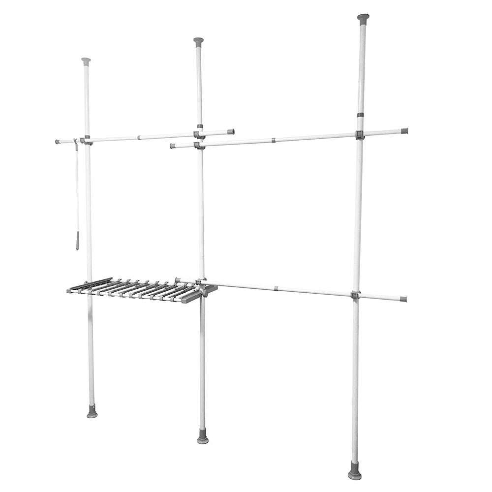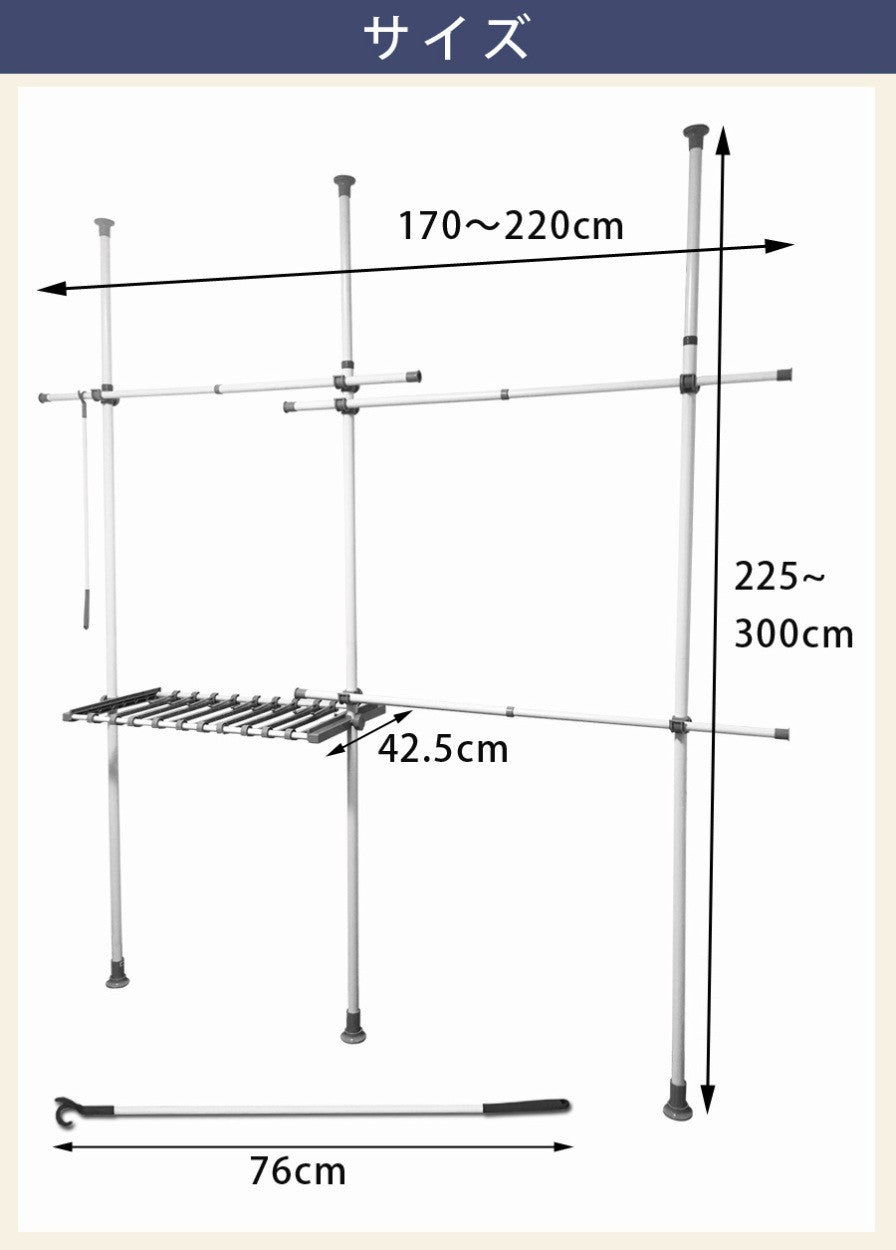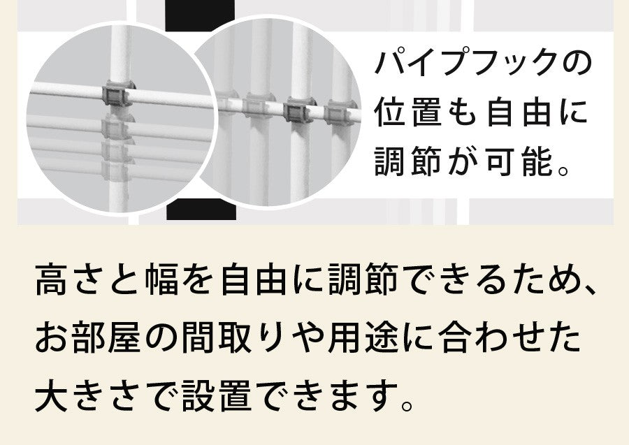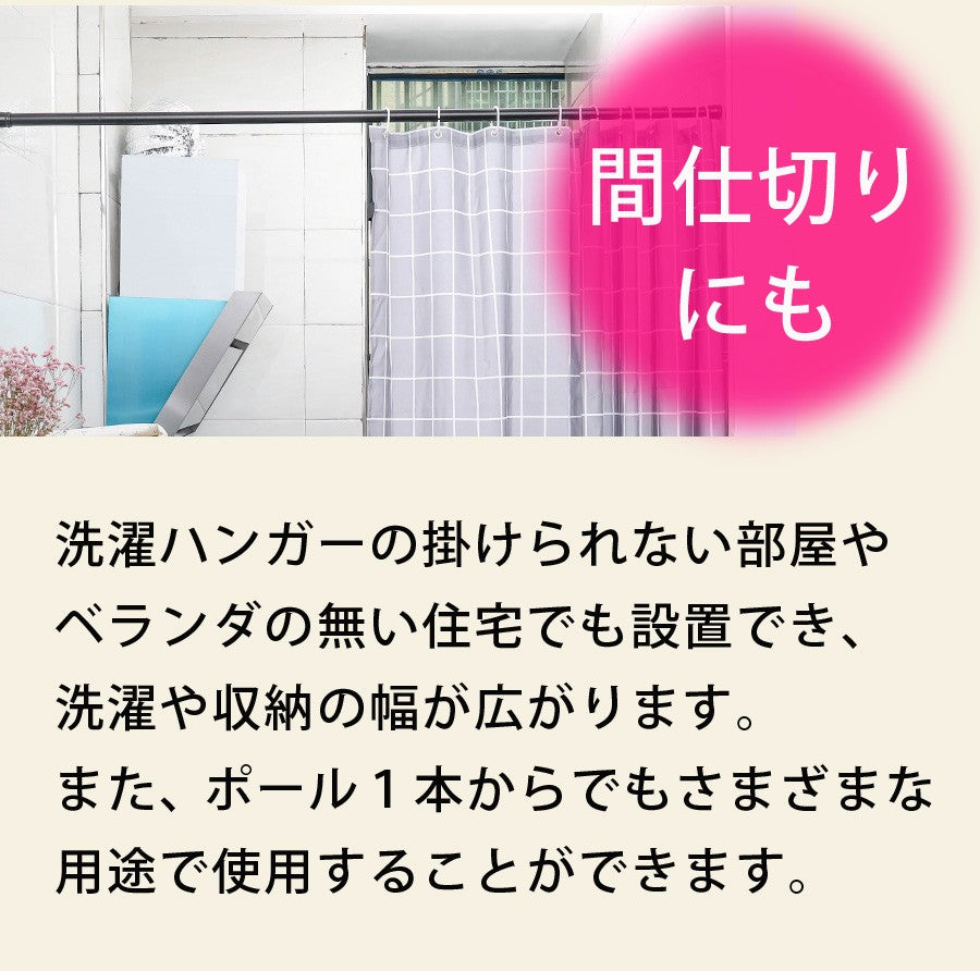 簡単設置で省スペース化&しっかり収納!お部屋につっぱるポールハンガー 空間を有効活用した収納 もてあましがちな縦のスペースを活用し無駄なくスッキリ収納。 衣類の洗濯、収納に大活躍 洗濯ハンガーの掛けられない部屋やベランダの無い住宅でも設置でき、 洗濯や収納の幅が広がります。また、ポール1本からでもさまざまな用途で 使用することができます。 つっぱるだけで簡単設置 床と天井にポールをつっぱるだけでしっかりと設置ができます。 穴をあけず、床や壁を傷つけないため、移動や撤去もラクラク。 1本から使える 縦のポールは1本でも独立して使用できます。 ※横向きでの使用する場合は重たい物の吊り下げは控えてください。 スペースに合わせて伸縮 高さと幅を自由に調節できるため、お部屋の間取りや用途に合わせた 大きさで設置できます。パイプフックの位置も自由に調節が可能。 また、中心のポールをクロスさせて組み合わせればお部屋の隅にもぴったり設置できます。 付属品 ・ハンガーアシスト 上段のポールに掛けたハンガーを取るのに便利なアシストが付属 ・スラックスハンガー 最大10本まで、パンツやボトムをより省スペースに収納できます。 |